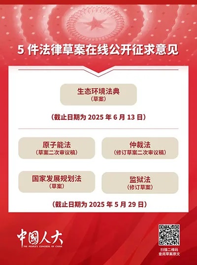 即日起,生態(tài)環(huán)境法典草案等5件法律草案公開征求意見。如有意見建議可以登錄中國人大網(wǎng)(www.npc.gov.cn)、國家法律法規(guī)數(shù)據(jù)庫(flk.npc.gov.cn)提出,也可以將意見寄送全國人大常委會法制工作委員會(北京市西城區(qū)前門西大街1號,郵編:100805。信封上請注明××法律草案征求意見)。
